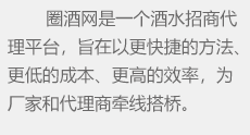 圈酒招商網(wǎng)是繼糖酒會(huì)之后的招商模式,為酒廠等生產(chǎn)經(jīng)銷企業(yè)搭建一個(gè)更好、更快的酒水招商平臺(tái)